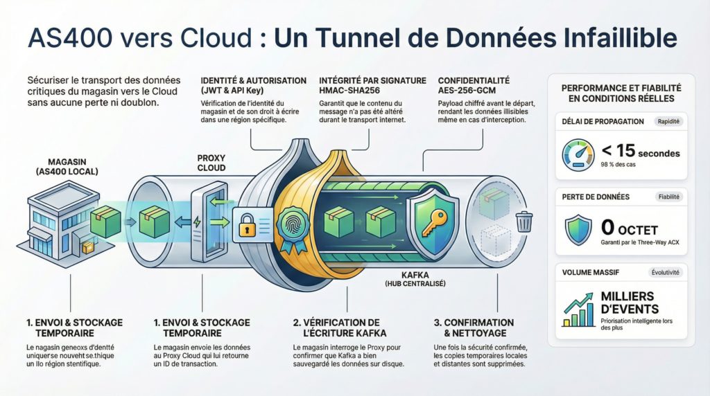 Tant que ce cycle n’est pas entièrement terminé, la donnée est considérée comme “non livrée”. En cas de coupure réseau ou d’incident, le processus reprend sans jamais créer de doublon ni perdre un événement.